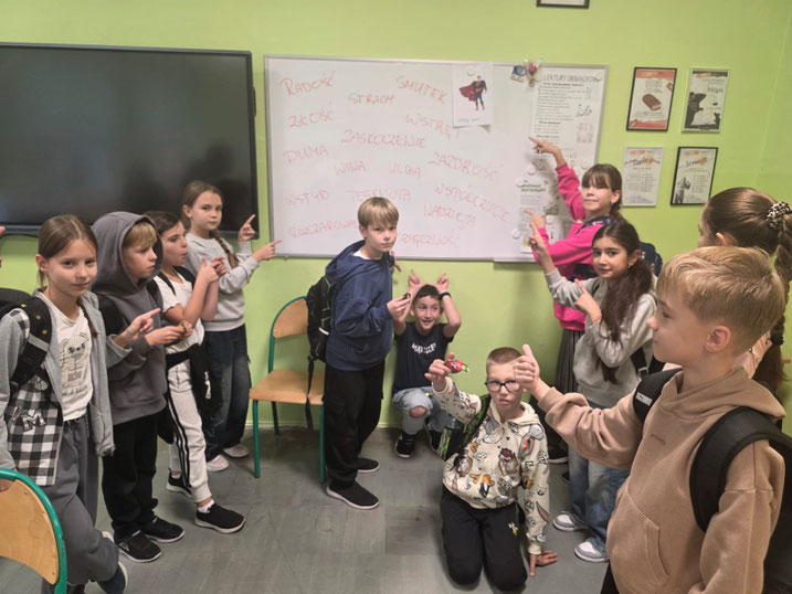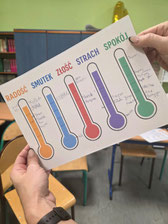 Zajęcia rozpoczęły się od pracy z „termometrem samopoczucia”, dzięki któremu mogliśmy określić swój aktualny nastrój i zauważyć, że każdy z nas doświadcza różnych emocji w ciągu dnia. Następnie, poprzez ćwiczenia w formie skojarzeń sytuacji z emocjami, zastanawialiśmy się, jakie uczucia mogą towarzyszyć różnym wydarzeniom z życia codziennego. Uczniowie pracowali też z kartami Dixit, interpretując ilustracje kojarzące się im z nimi samymi i przypisując im emocje. W części końcowej odbyła się zabawa krzesełkowa - element ruchu i współpracy sprawił wszystkim dużo radości.