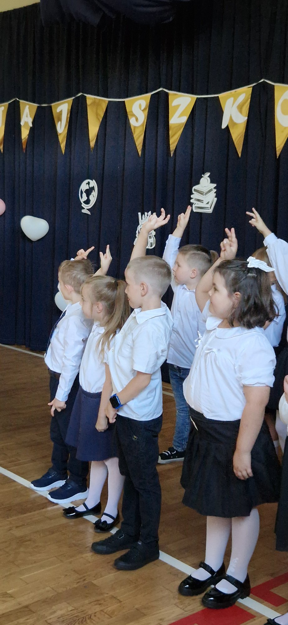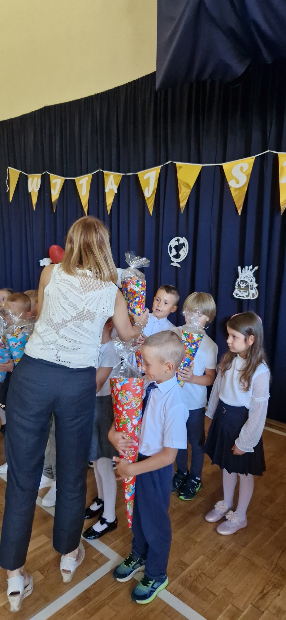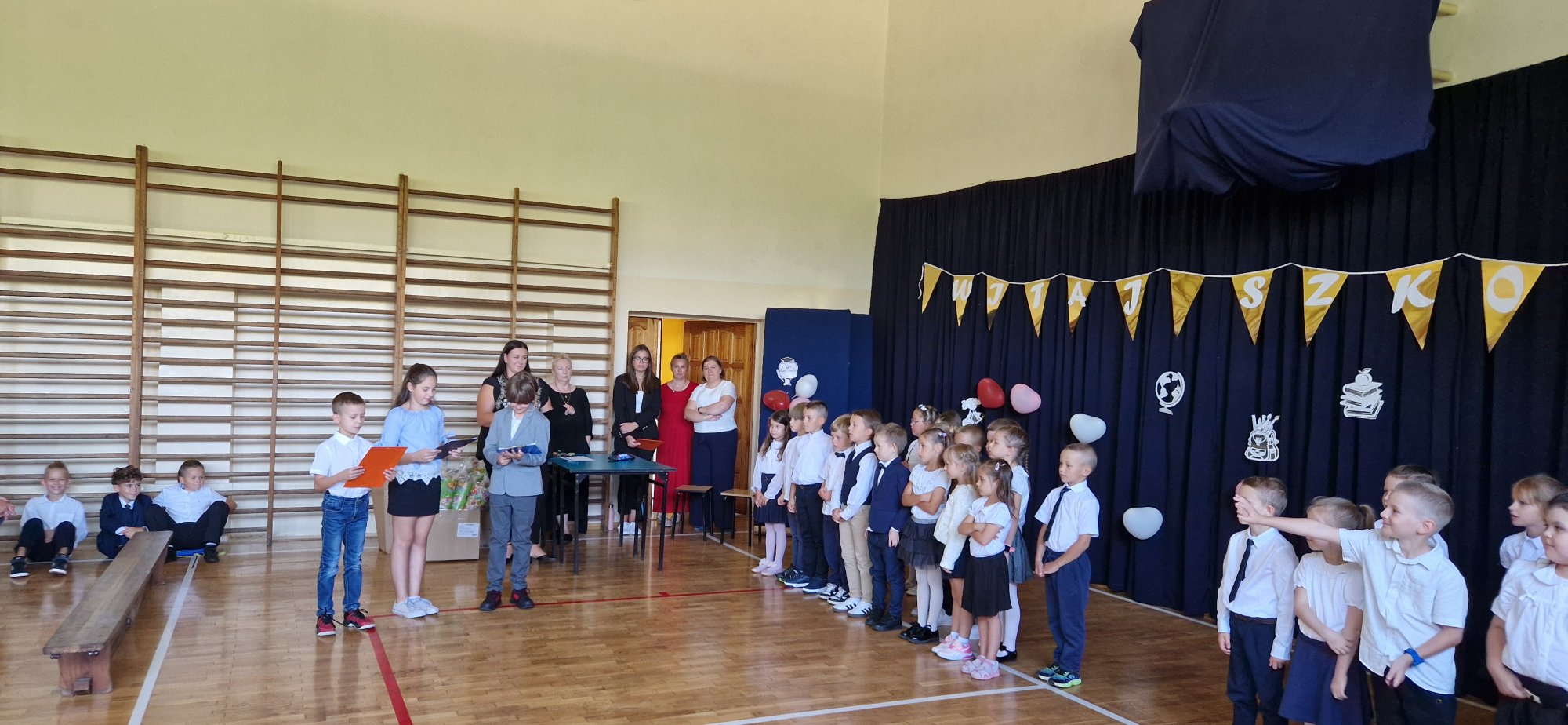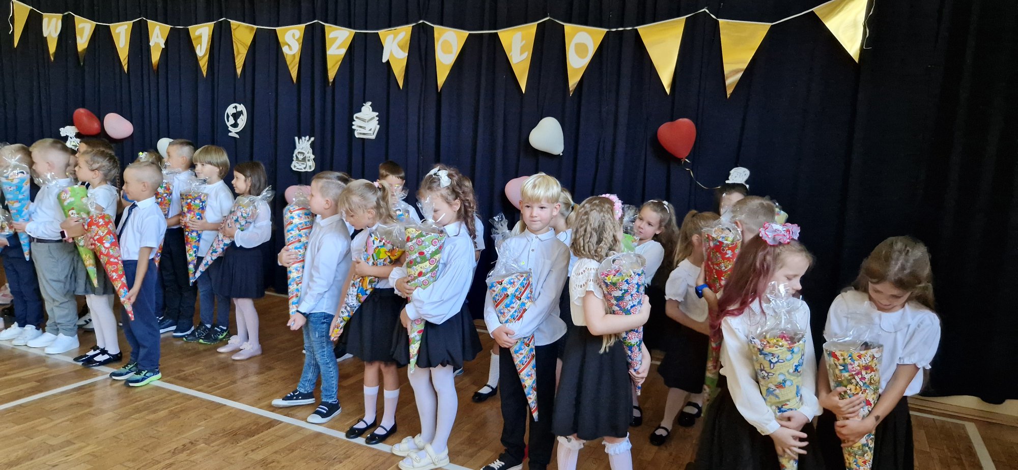 W wyjątkowej atmosferze, w obecności rodziców, uczniowie klas 1a i 1b zostali uroczyście przyjęci do społeczności szkolnej. Ceremoniał poprowadzili ich starsi koledzy z klasy 4 a, którzy z dumą wprowadzili pierwszoklasistów w szkolne życie. Kulminacyjnym momentem wydarzenia było pasowanie na ucznia, którego dokonała pani dyrektor Marta Porębska. Na zakończenie uroczystości wychowawcy wręczyli dzieciom rogi obfitości – symbol radości, dostatku i nowych szkolnych przygód i zabrali swoich uczniów i rodziców do klas.