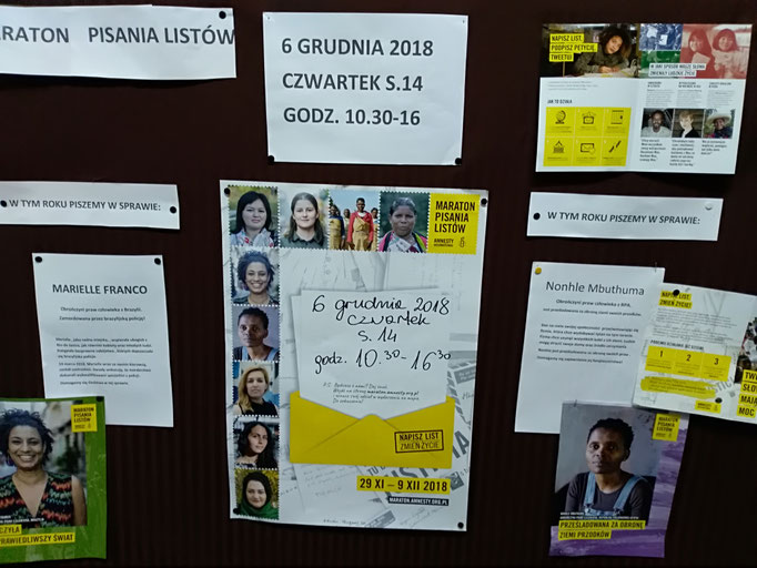W tym roku napisaliśmy łącznie 228 listów! Brawo! Jest to jak dotąd rekord. Napisaliśmy do prezydenta Brazylii  114 listów domagając się sprawiedliwości dla zamordowanej przez policję Marielle Franco. Drugą postacią maratonu była Nonhle Mbuthuma- również 114 listów. Domagaliśmy się bezpieczeństwa dla niej ponieważ walczy z korporacją.