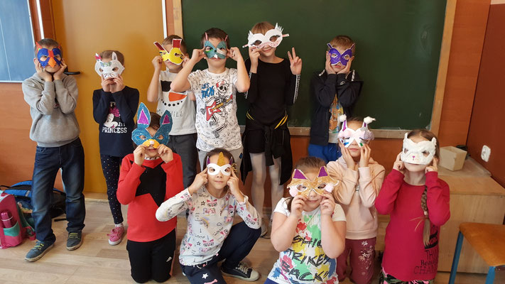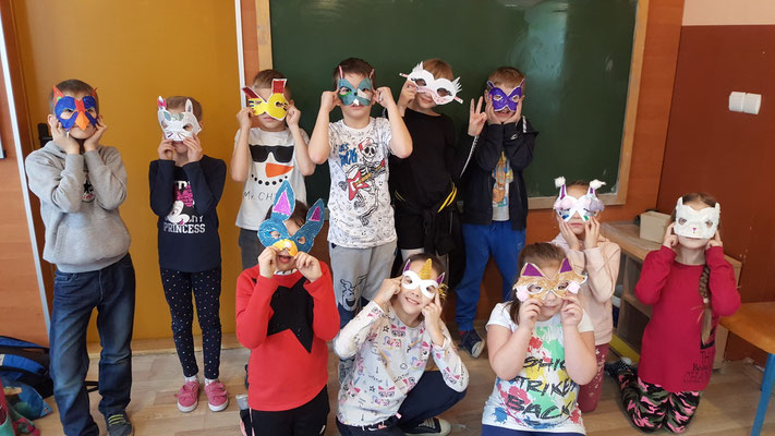 W świetlicy szkolnej uczniowie projektowali  sami maski karnawałowe.