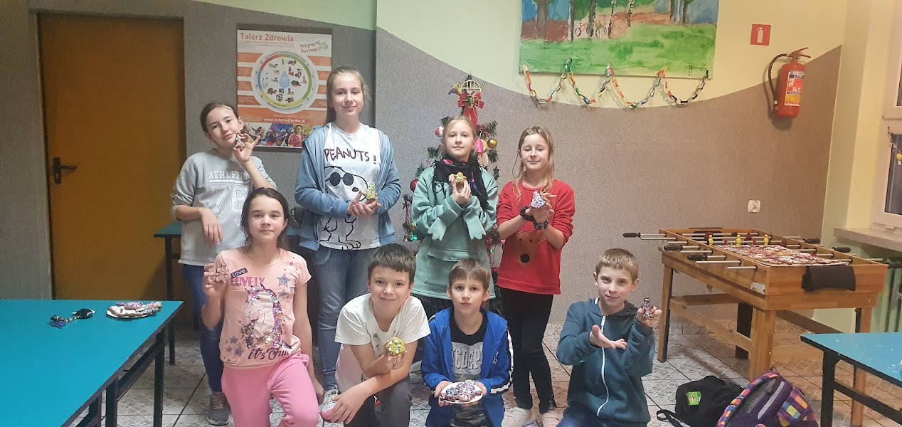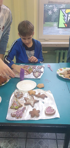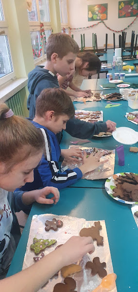 Uczniowie klas 4  i 5 wzięli dziś udział w warsztatach dekorowania pierniczków bożonarodzeniowych. Każdy uczestnik dostał   10  pierniczków w przeróżnych kształtach. Korzystając z lukrów, różnobarwnych posypek i dekoracji, dzieci stworzyły arcydzieła smakowite arcydzieła. Nie obyło się oczywiście bez podjadania posypek, podgryzania pierniczków czy próbowania lukru cytrynowego.  Dekorowanie  świątecznych ciasteczek  nie jest trudne, ale wymaga cierpliwości i precyzyjności. To wspaniała zabawa,  wystarczy kilka kresek i kropek, aby ubrać drzewko w bombki i łańcuchy, obdarzyć ludzika uśmiechniętą miną, a bałwana – guzikami z węgielków i marchewkowym nosem. Pachnące ciasteczka mogą stać się miłym podarunkiem, zawisnąć na choince lub urozmaicić świąteczny stół. Nasze pierniczki zostały podzielone na połowę. Każdy uczestnik część pierniczków zabrał do domu, a drugą część zostawił w szkole. \zostaną one już jutro wystawione na naszej grupie z licytacjami.
