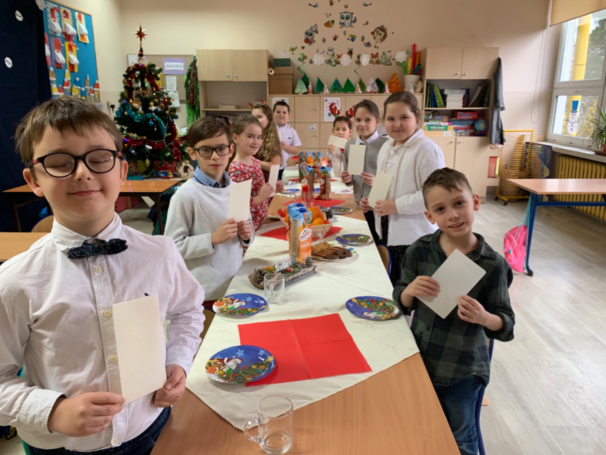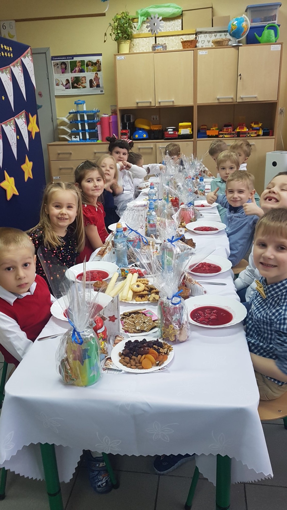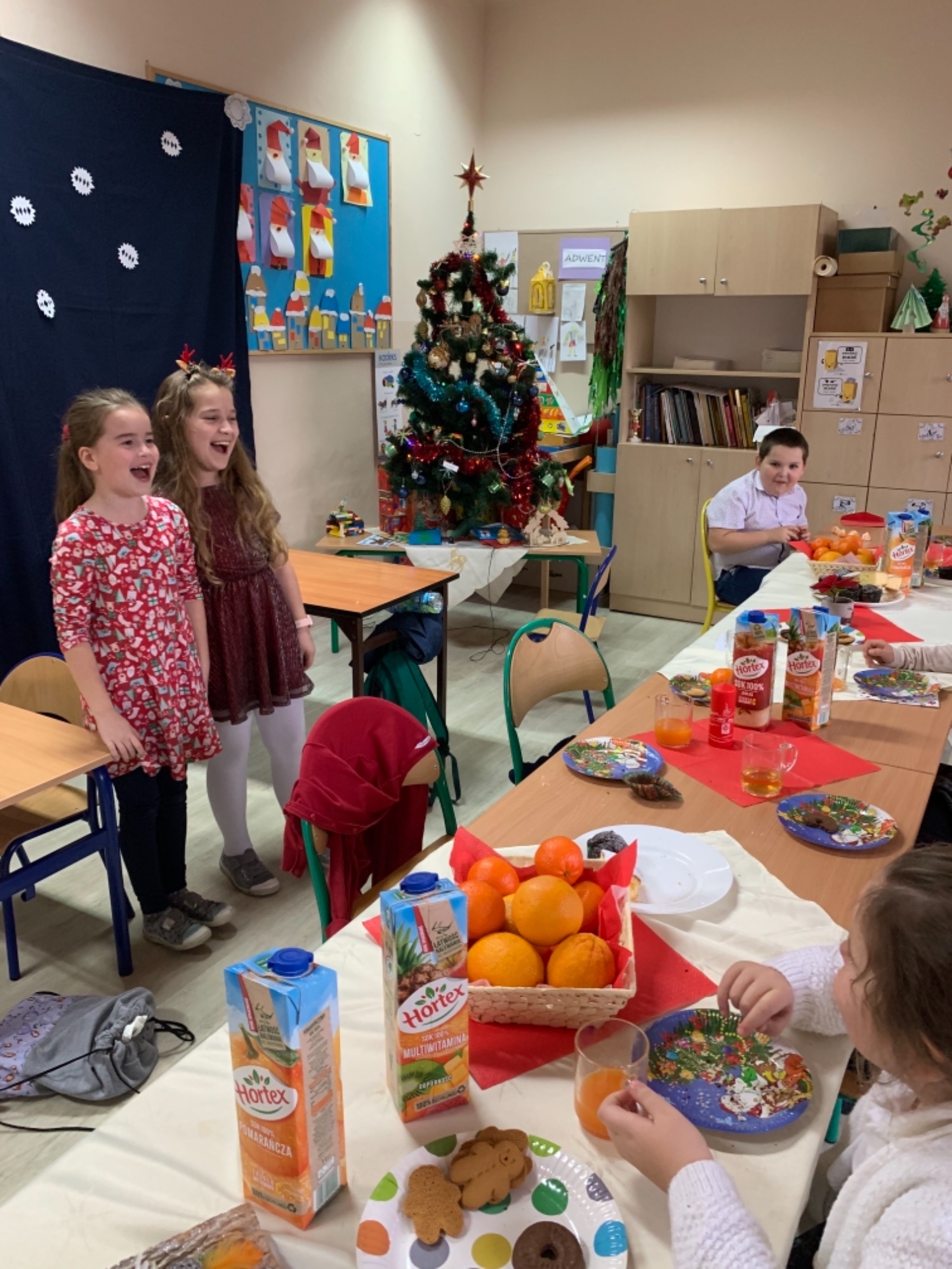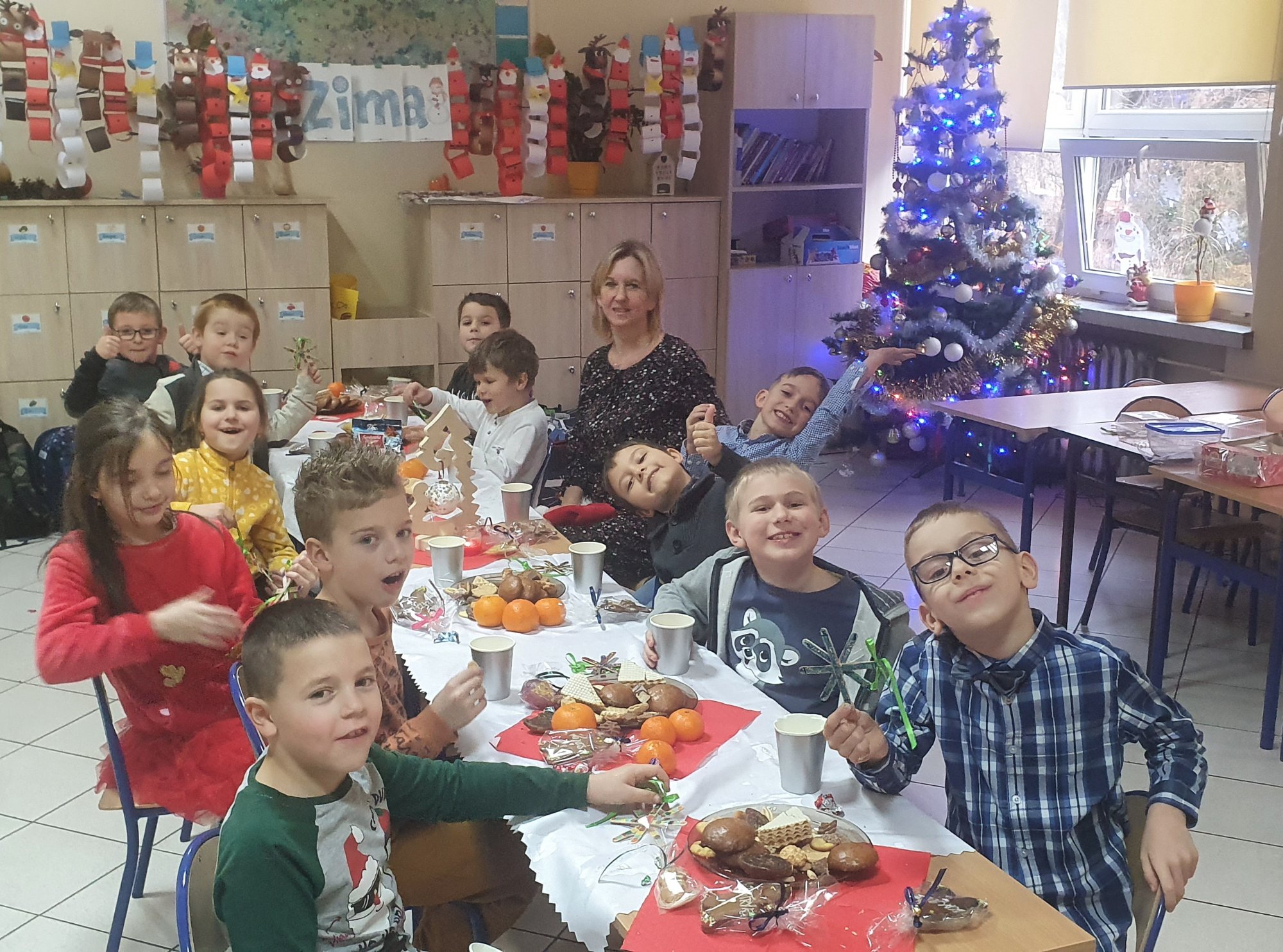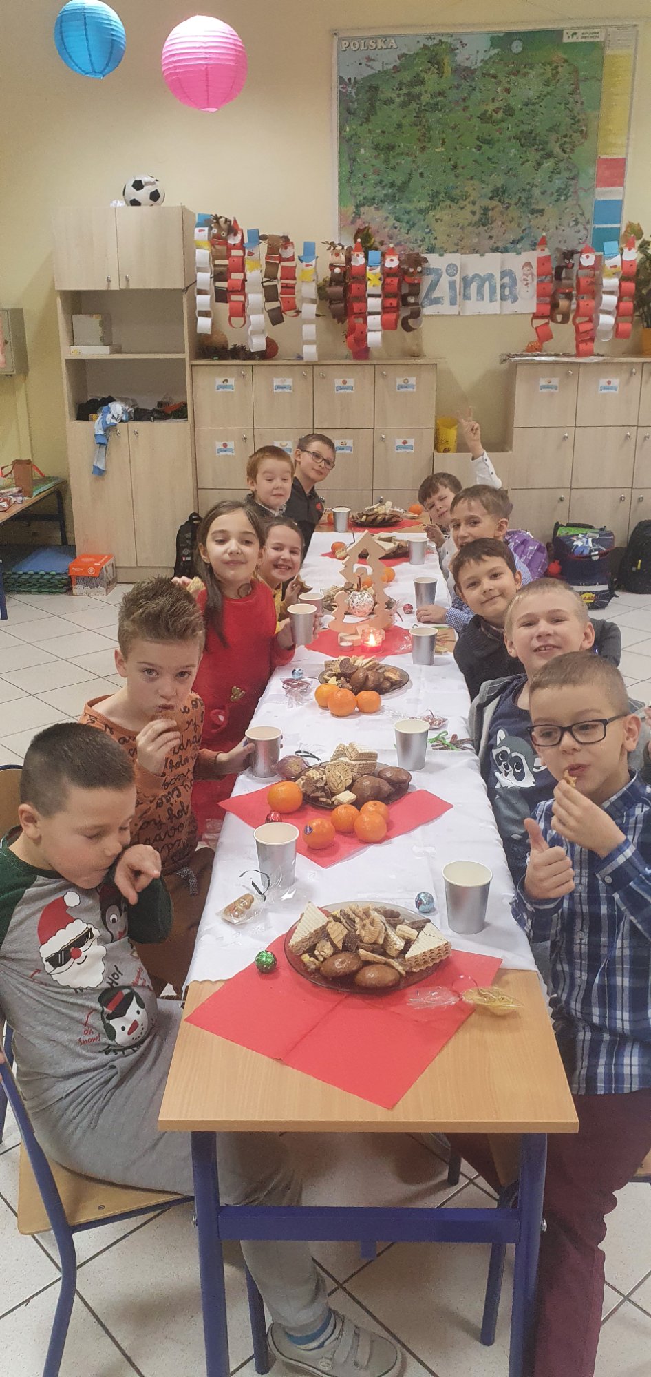 Uczniowie klas 1-5 oraz nasze przedszkolaczki w minionych dniach obchodzili swoje szkolne wigilijki. Dzieci dzieliły się opłatkiem i składały sobie życzenia na Święta Bożego Narodzenia. W świąteczny nastrój wprowadziło nas wspólne śpiewanie kolęd przy świątecznym poczęstunku pysznych ciasteczek i pierników. Po wspólnej degustacji uczniowie przystąpili do świątecznych zabaw edukacyjnych. To był szczególny dzień pełen radości w klasowym zespole kolegów i koleżanek. Dziękujemy Rodzicom za pomoc w przygotowaniach.