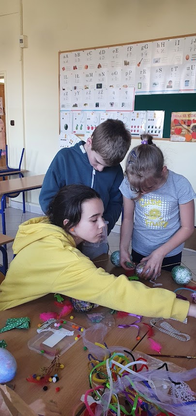 Dzieci ozdabiały wielkie jaja styropianowe za pomocą folii bąbelkowej oraz różnorakich ozdób, ozdóbek i ozdóbeczek. Powstały naprawdę piękne dekoracje wielkanocne.
