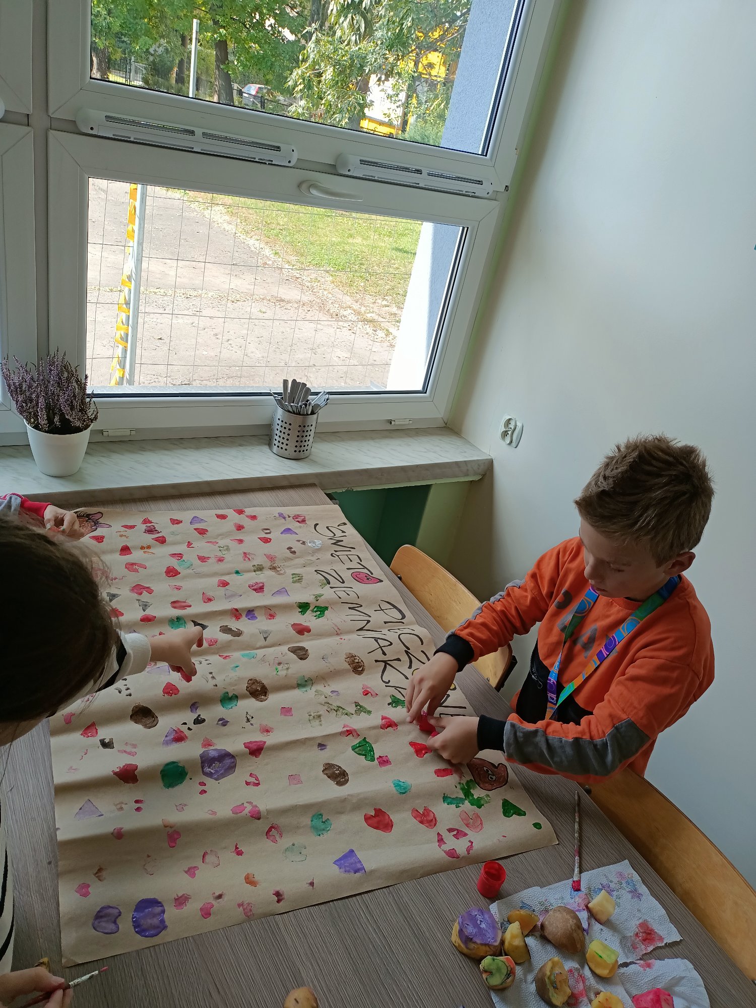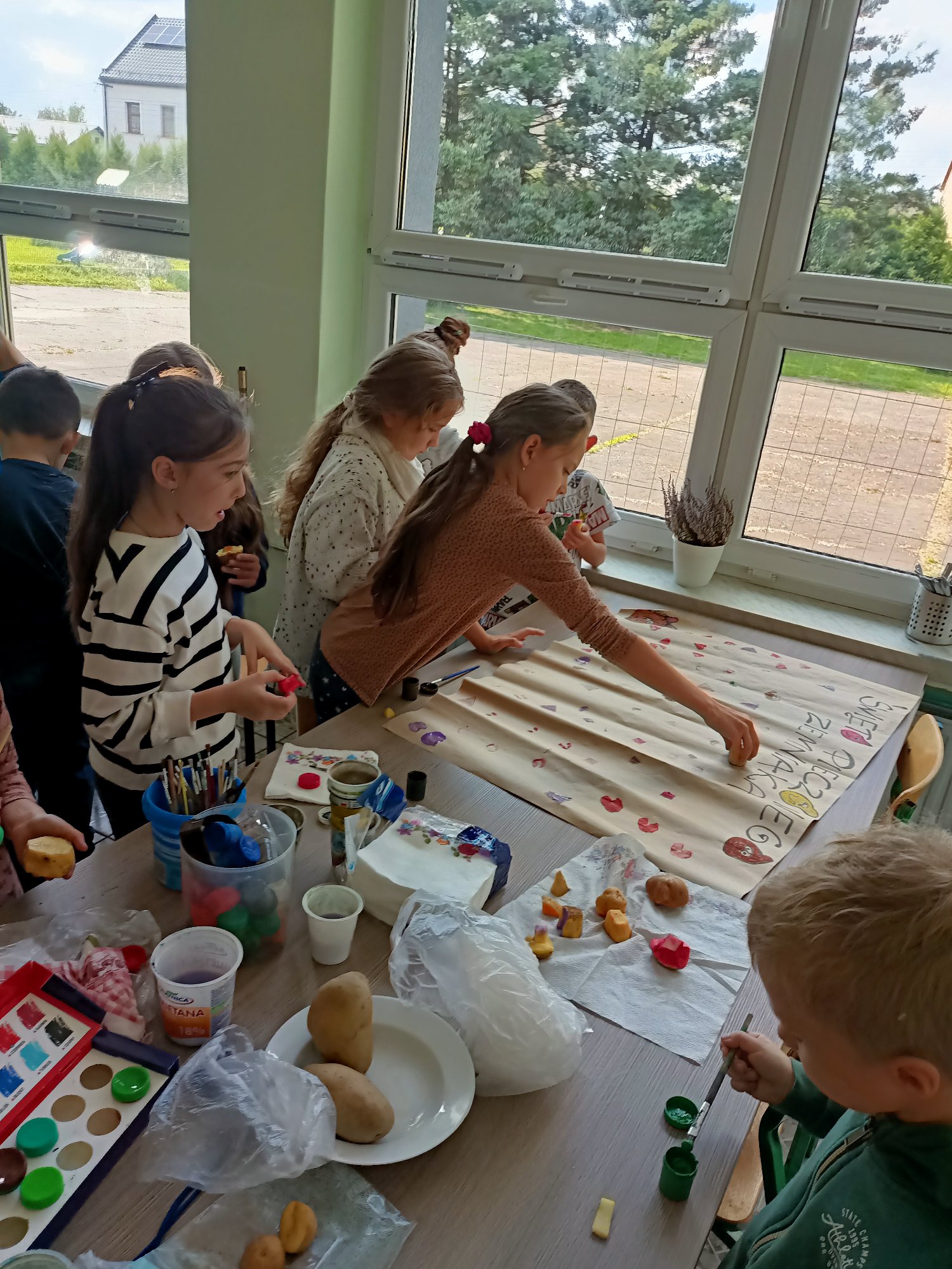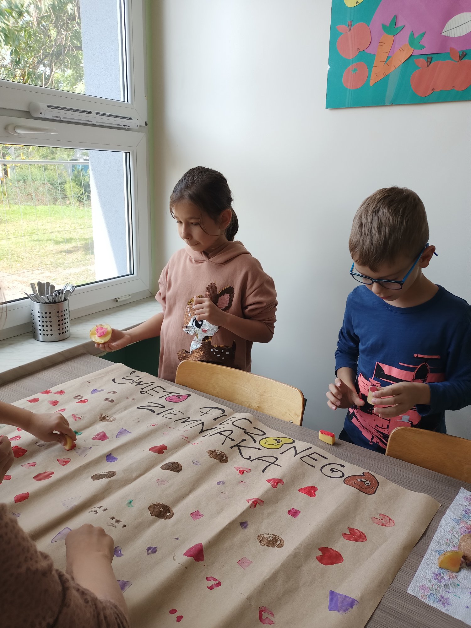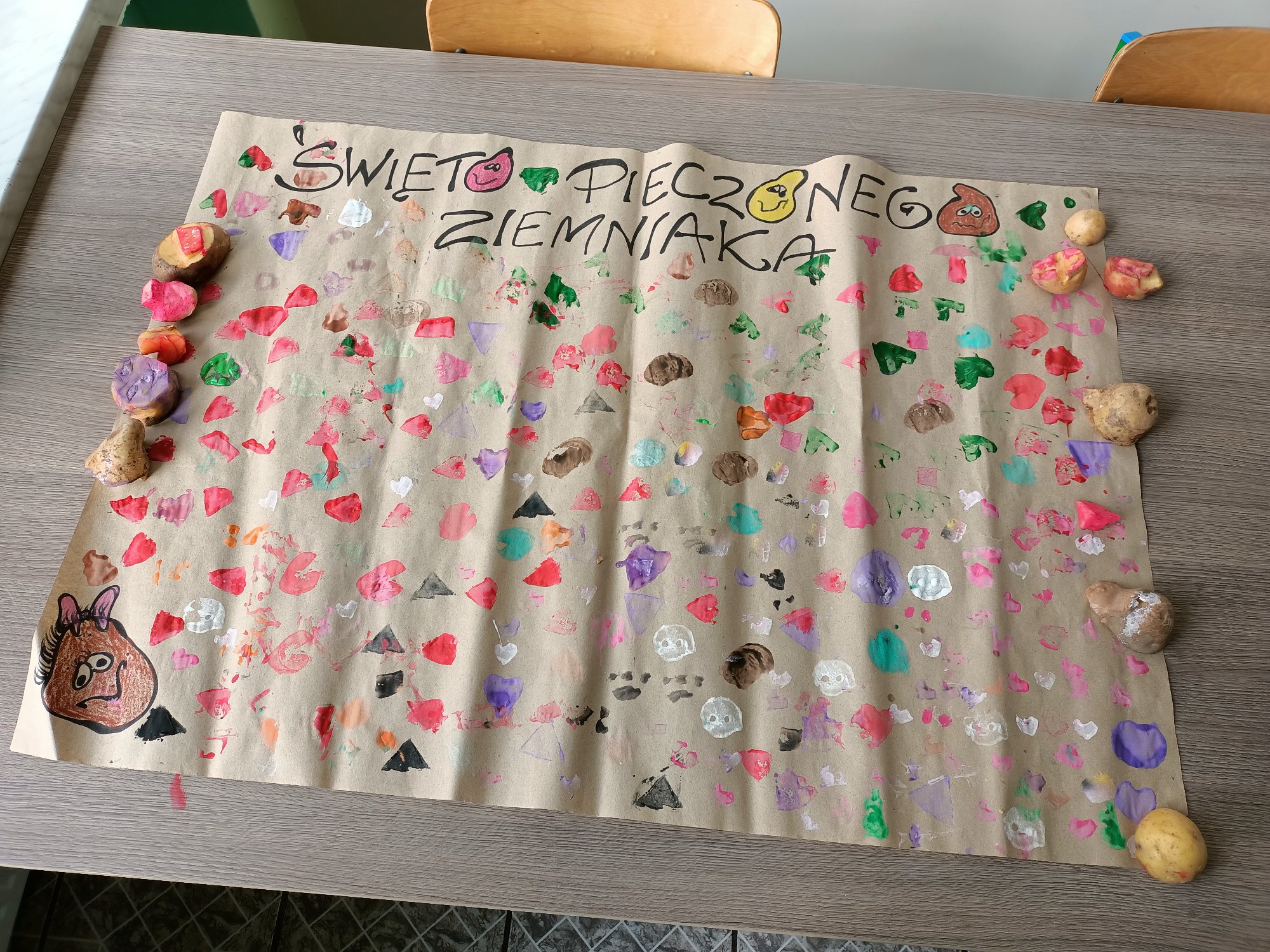 Po wysłuchaniu historii sprowadzenia do Polski w 1683 roku przez króla Jana III Sobieskiego ziemniaka, jako prezentu dla swojej żony Marysieńki uczniowie uruchomili swoją wyobraźnię i wyczarowali cudaczny ziemniaczany plakat. Świetlica wypełniła się ziemniaczanymi stemplami, który każdy z uczniów wykonał samodzielnie. Pamiątkowy stempelek został odbity na naszym plakacie.