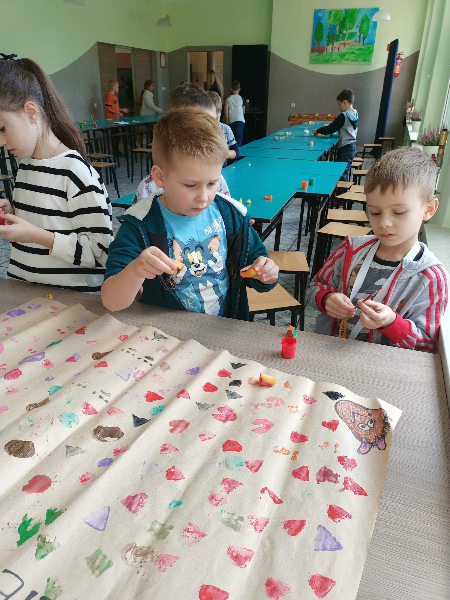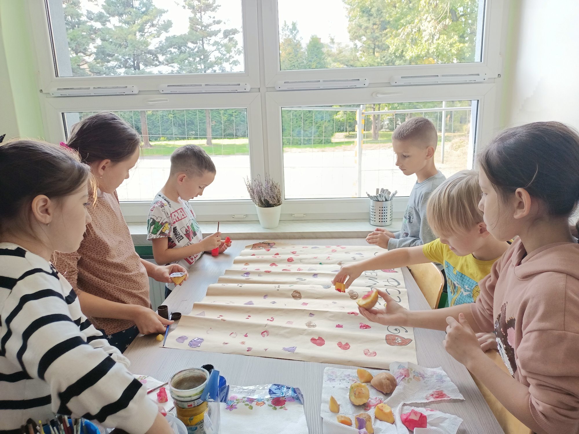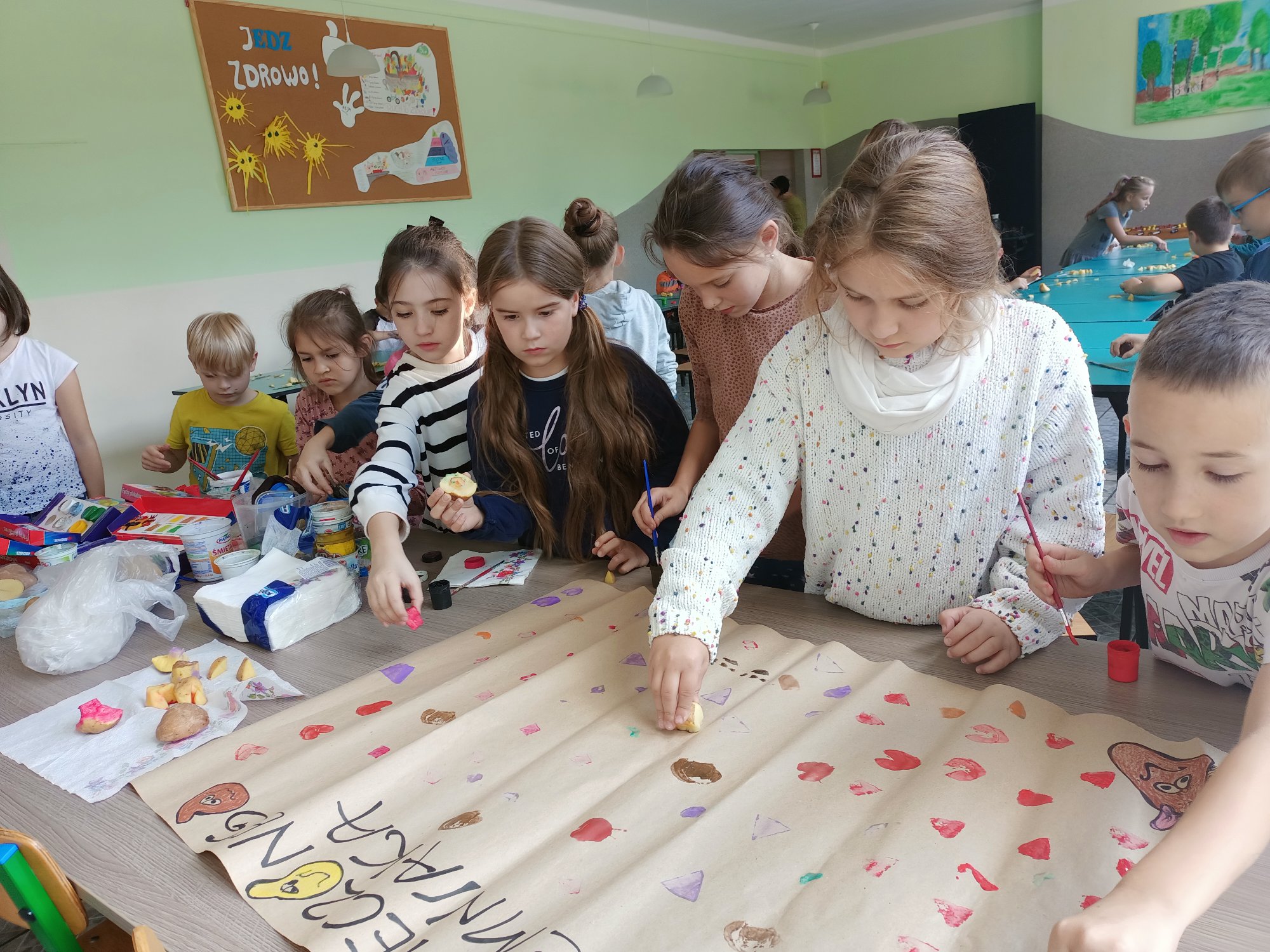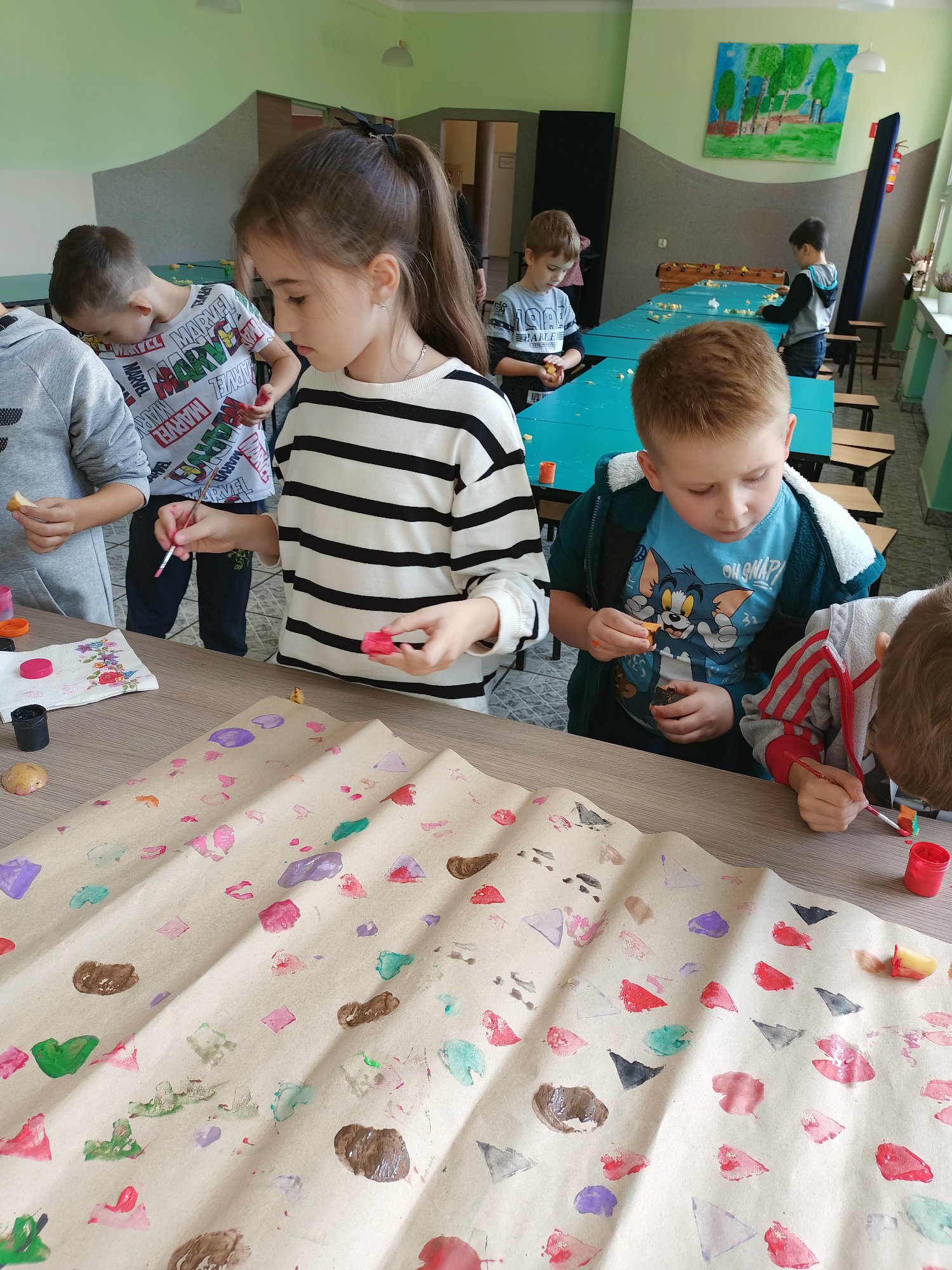Po wysłuchaniu historii sprowadzenia do Polski w 1683 roku przez króla Jana III Sobieskiego ziemniaka, jako prezentu dla swojej żony Marysieńki uczniowie uruchomili swoją wyobraźnię i wyczarowali cudaczny ziemniaczany plakat. Świetlica wypełniła się ziemniaczanymi stemplami, który każdy z uczniów wykonał samodzielnie. Pamiątkowy stempelek został odbity na naszym plakacie.