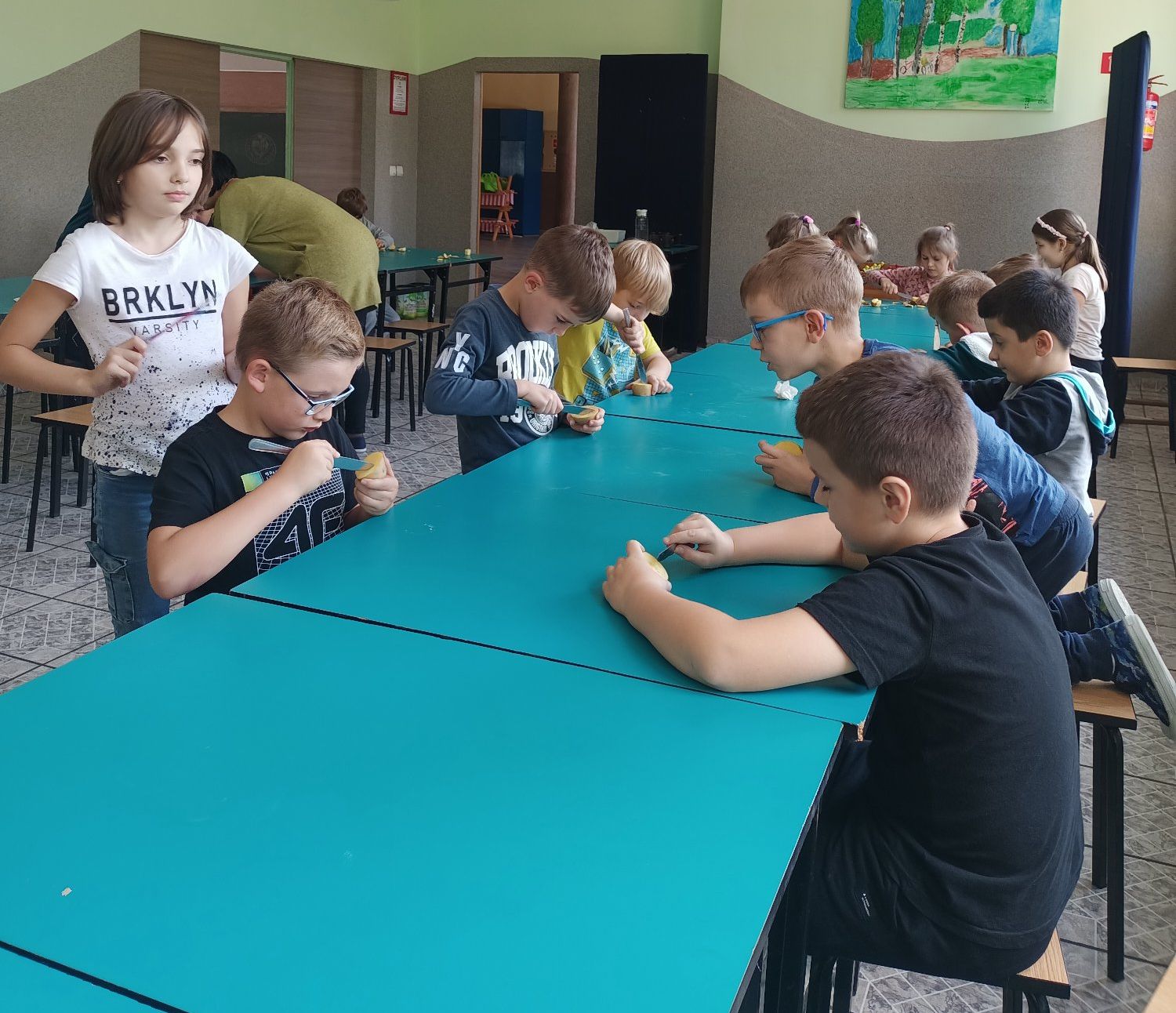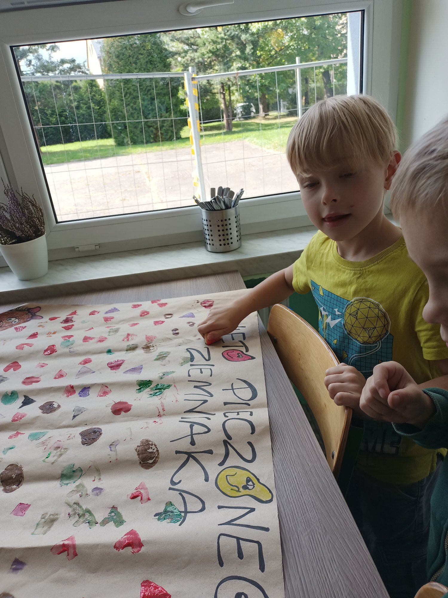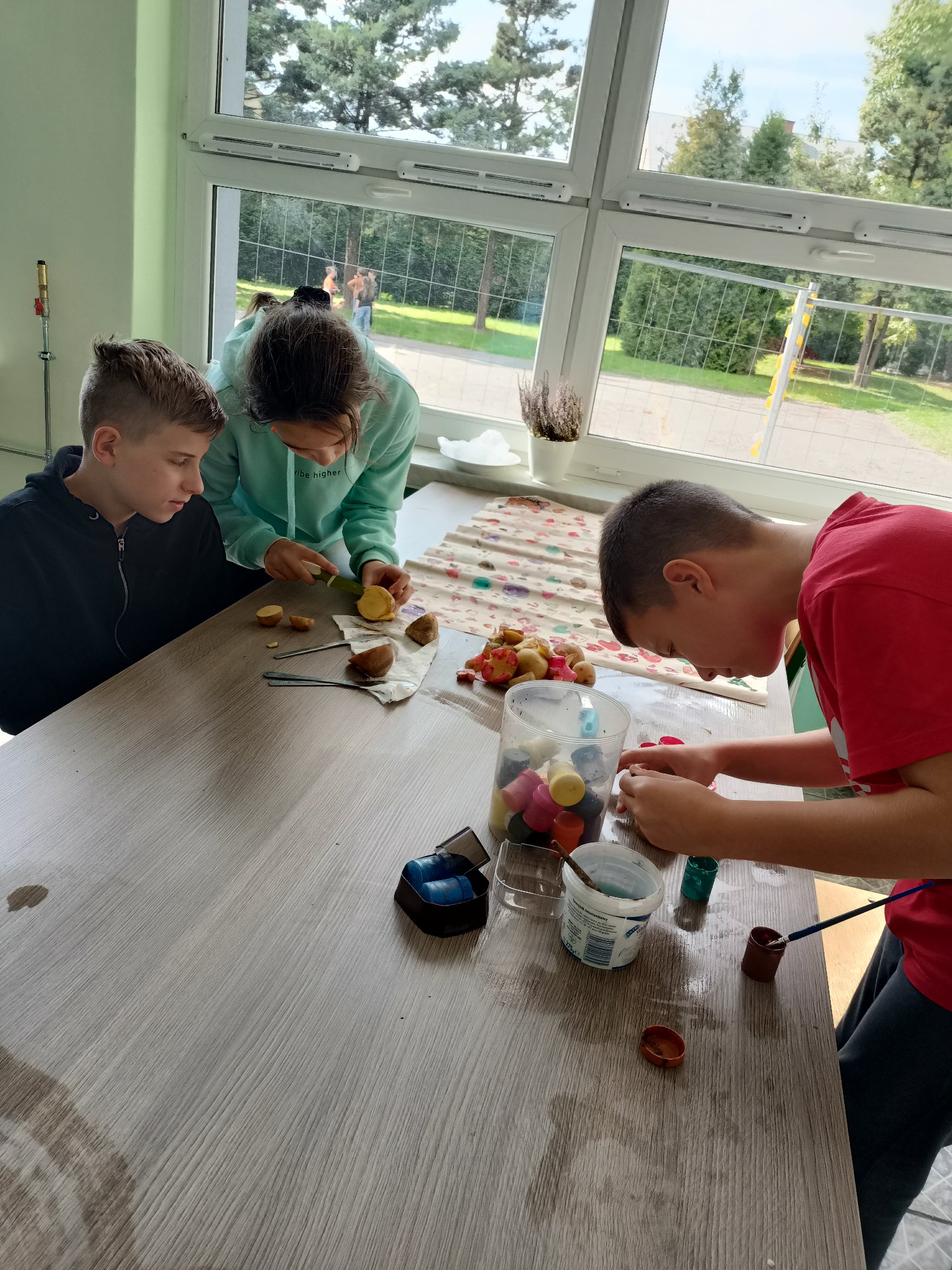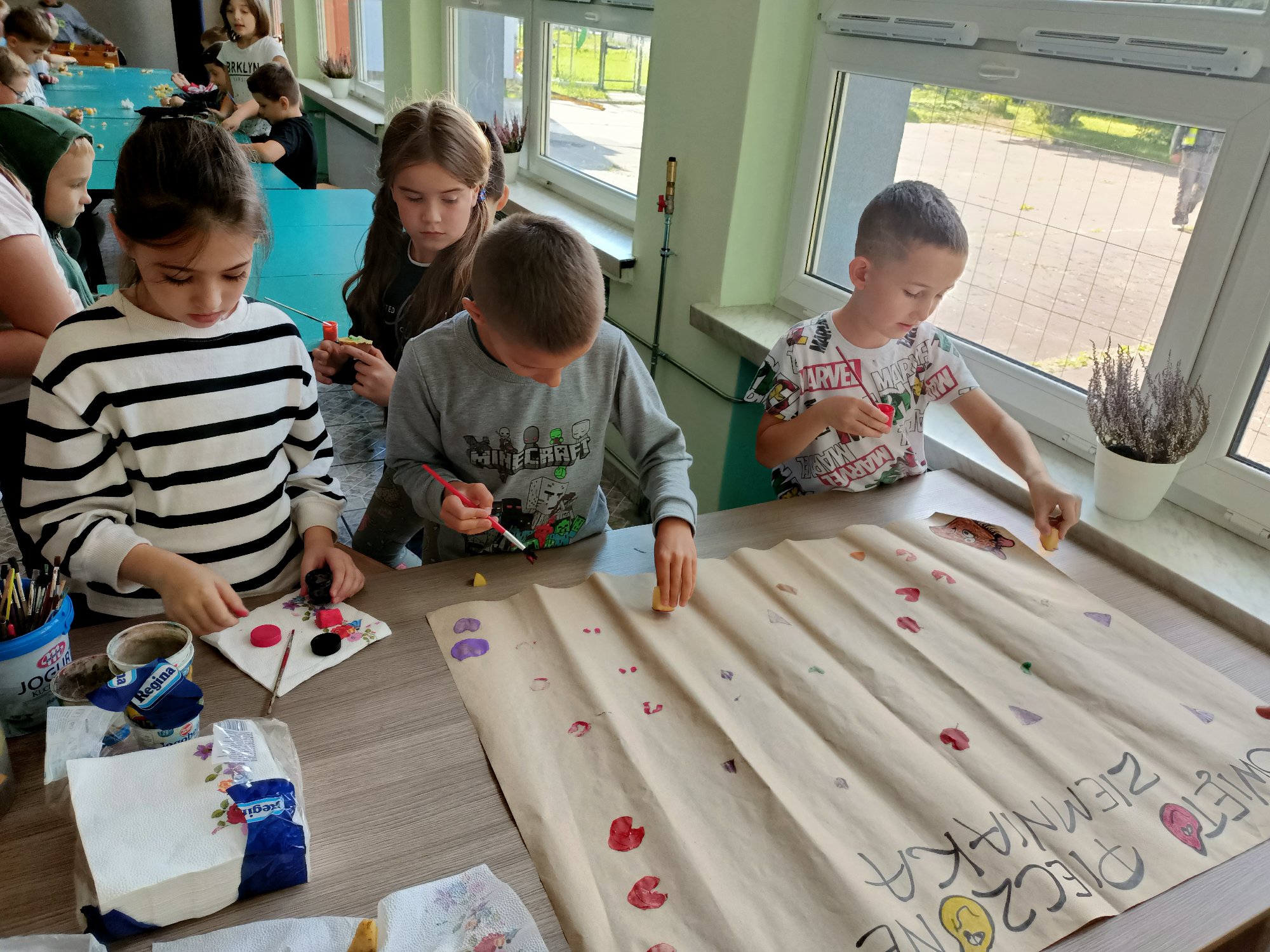 Po wysłuchaniu historii sprowadzenia do Polski w 1683 roku przez króla Jana III Sobieskiego ziemniaka, jako prezentu dla swojej żony Marysieńki uczniowie uruchomili swoją wyobraźnię i wyczarowali cudaczny ziemniaczany plakat. Świetlica wypełniła się ziemniaczanymi stemplami, który każdy z uczniów wykonał samodzielnie. Pamiątkowy stempelek został odbity na naszym plakacie.